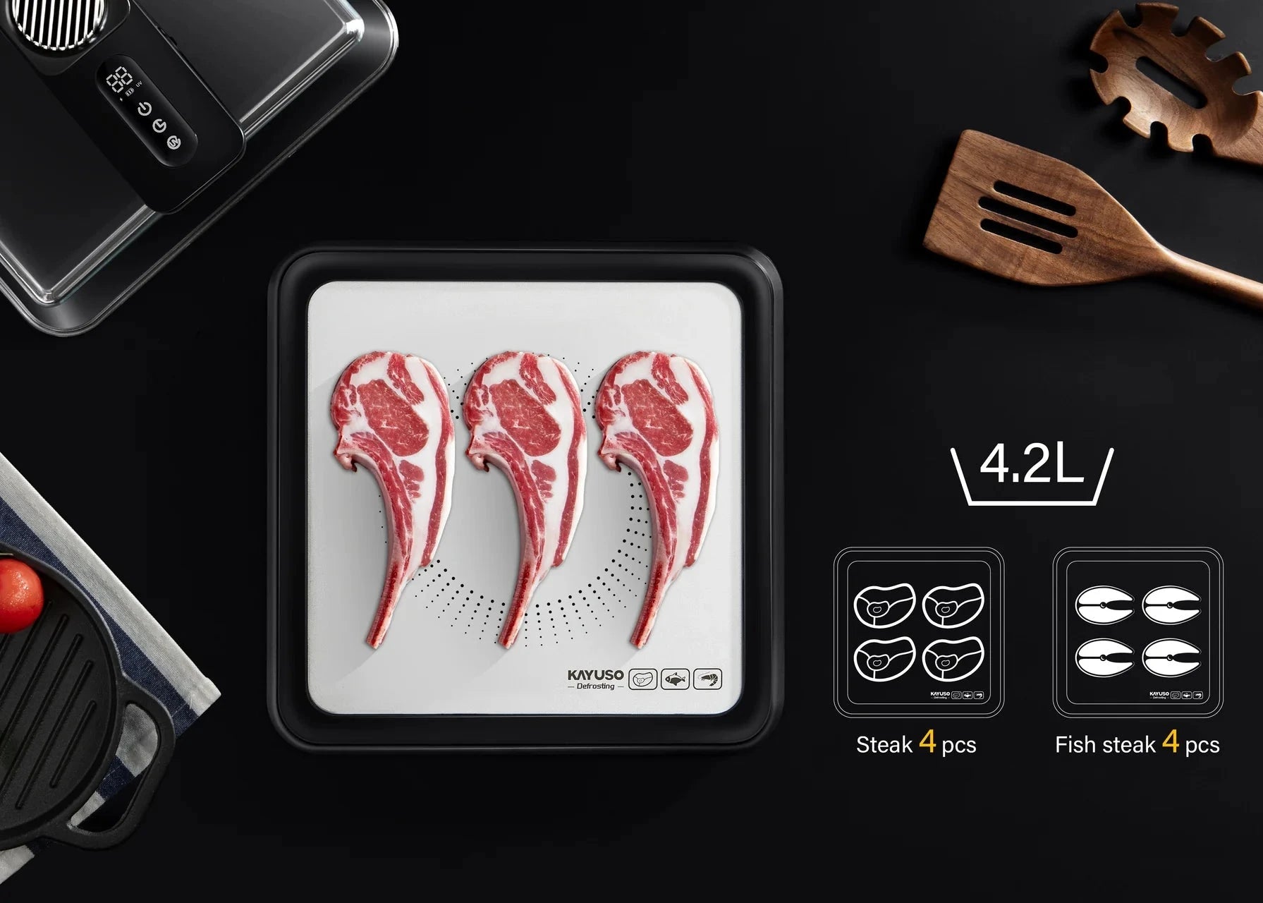Whether it’s preparing a high-quality steak, delicate seafood, or fresh vegetables, KAYUSO makes defrosting effortless and enjoyable. and bring new levels of quality to every meal.